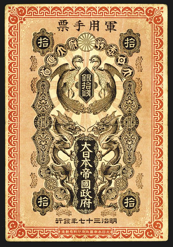 Japan, 10 Sen, P-M1b, Issued banknote without serial numbers on back, Black on red-brown underprint, back red-brown, Choice VF to XF with one light horizontal fold from keeping it from XF. Attractive note.