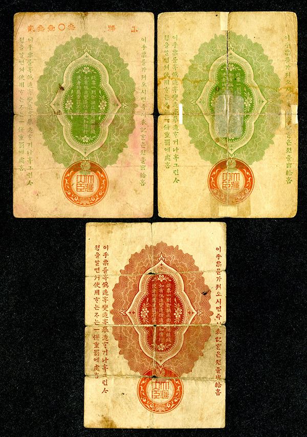Japan. 10, 20 Sen. P-M1a, M1b, M2b. Scarce group. Good-Very Good with old hinge repairs. 3 pieces. (The Pogrebetsky Family Archives)