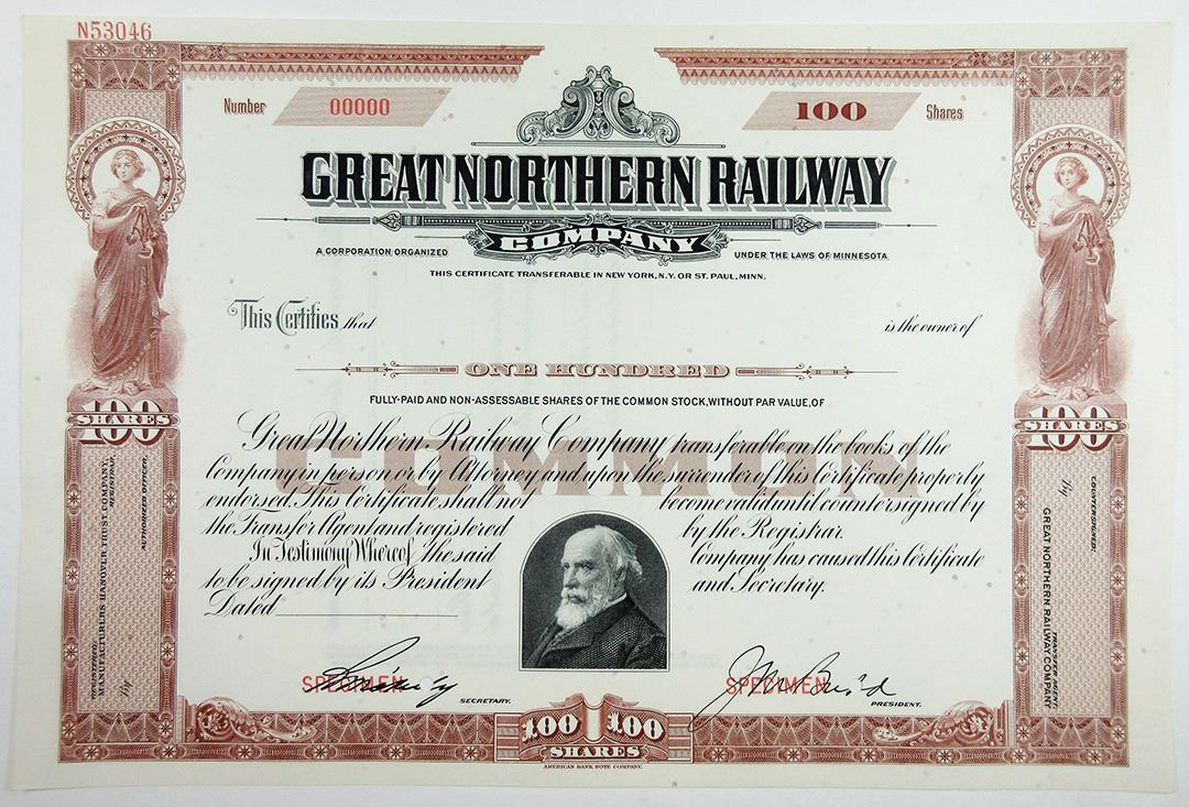 Minnesota, ND (ca.1920-40s). 100 Shares Specimen Stock Certificate, Black on brown border and underprint, Company title at top with small portrait of founder, James J. Hill, at bottom, Specimen overprints and POCs, AU condition, ABNC.