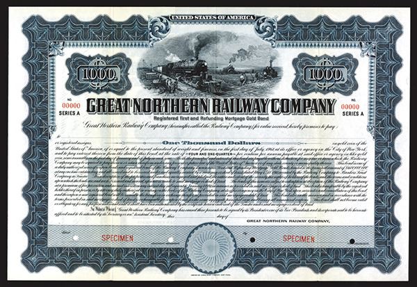 Minnesota. $1000 Specimen 4 1/4 Series A Registered First and Refunding Mortgage Gold Bond in a vertical format. Black print with a blue/grey border and under tint. Vignette of a locomotive with farmers and workers in the background at top. Specimen over prints, POC's, VF-XF condition with all coupons attached. ABNC.