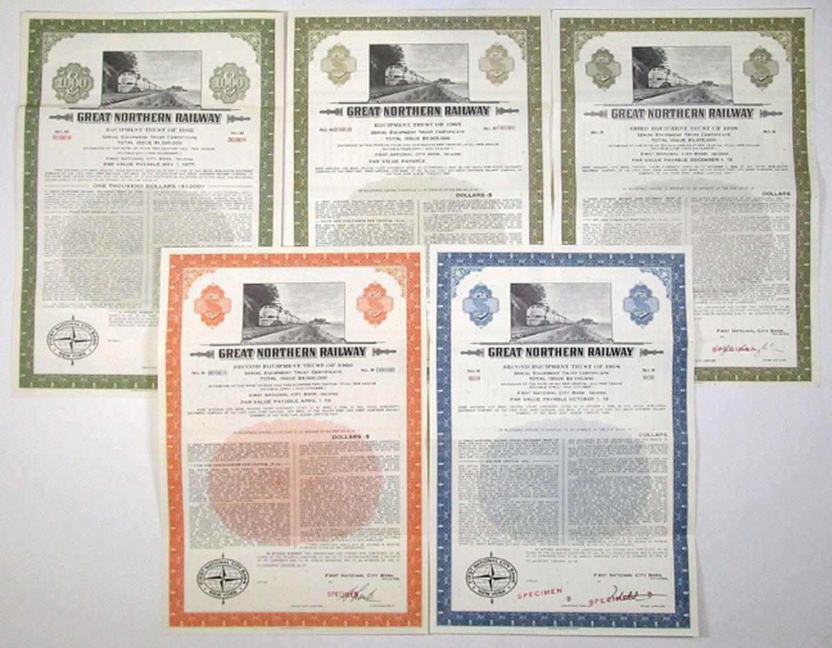 Lot of 5 Specimen Equipment Trust Certificates, including: 1962 $1000 4% Coupon Bond with olive border; and 4 Registered Bonds, including 1965 $Odd 4 1/8% Bond with olive border; 1966 $Odd 5.25% Bond with orange border; 1968 $Odd 6% Bond with blue border; and $Odd 6.5% Bond with olive border, All with same vignette of train passing by bay at top center. All have red specimen overprints and POCs. Condition ranges from XF to Unc. ABNC. (5). Sold "AS IS" No returns accepted. Several are Unlisted in Cox.