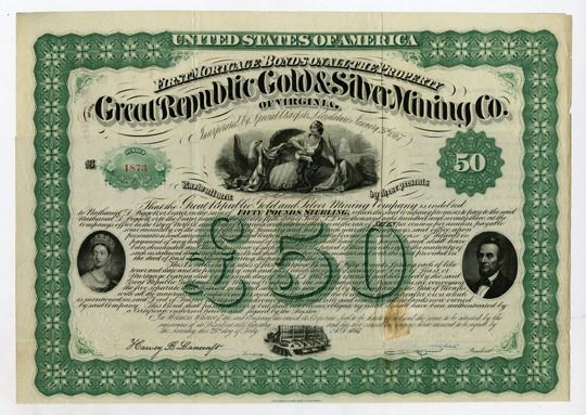 Virginia...., 1867. 50 Pounds Sterling I/U 7% First Mortgage Coupon Bond, Black on green border and underprint, Portrait of Queen Victoria and left and Abraham Lincoln at right, VF-XF condition with large stain at bottom, CBNC. (ex. John E. Herzog Collection)