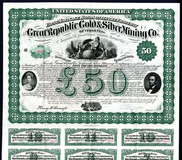 Virginia, 1867, 50 Pounds Sterling, Coupons attached, attractive bond with vignettes of Queen Victoria at left, Lincoln at right and patriotic allegorical image on top, Coupons attached, XF condition with folds as issued. Rare Continental BNC certificate.