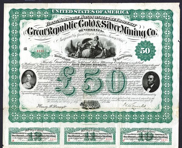 Virginia (Mines located in Nevada), 1867, 50 Pounds Sterling, Coupons attached, attractive bond with vignettes of Queen Victoria at left, Lincoln at right and patriotic allegorical image on top, Coupons attached, XF condition with folds as issued. Rare Continental BNC certificate.