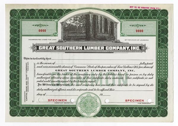 Louisiana. Odd Shares Common Stock Specimen Certificate. Black print with an ornate green border and under print. Vignette of a forest of trees at top center of certificate. Specimen overprints, POC's, XF condition, SBNC.