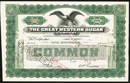 New Jersey, 1928, 100 Shares, Issued and Cancelled Stock, #NY10894, Black on green border and underprint, Bald Eagle on bee hive top center, Black cancelled stamps and POC's, Fine condition, ABNC.