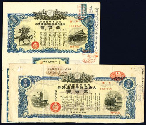 Greater East Asia War Treasury Bonds Lot of 2. 1). Greater East Asia War Special Treasury Bond 100 Yen, #1127247, 1945 Issued Bond release ro, Black print on blue border and yellow underprint, Statue of Kusunoki Masahige on left and Nanko-san Temple on right, VF condition. 2). Greater East Asia War Treasury Bond 100 Yen, #1337170, 1943 Issued Bond release to, Black print on blue border and violet underprint, Tank on the right and battleship on the left, Fine condition.
