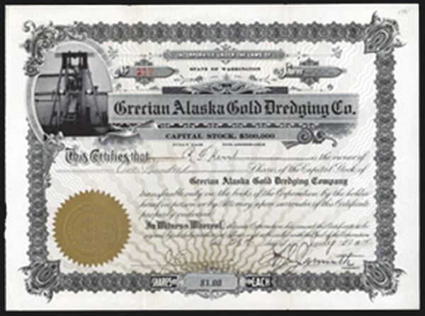 Alaska, 1915, 100 Shares, #312, I/U stock certificate, Black border with unique Photograph vignette of Dredging Equipment on top left, Gold Company Seal, XF condition, Rare Alaska mining stock and first time seen by cataloger.