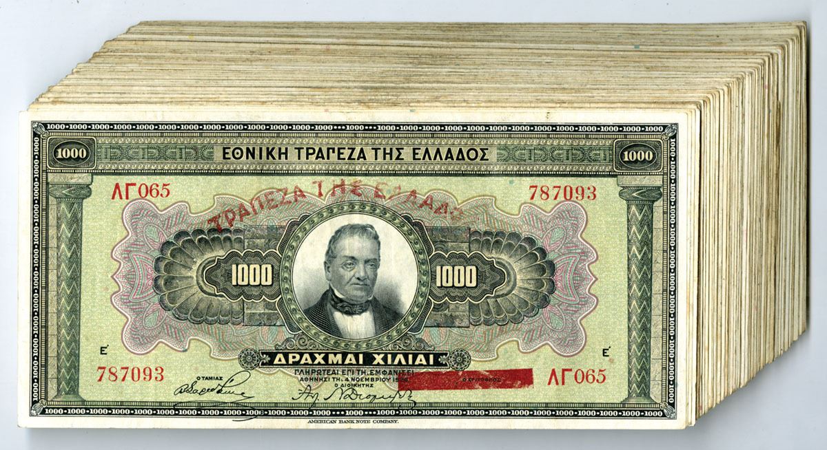 Greece, 1926. 1000 Drachmai, P-100, Issued Banknote Assortment, Black on green and m/c underprint with portrait of G. Stavros at center, Back is blue and pink underprint with stone carving at center with new bank name in curved writing at top. Notes range from Fine to VF condition. (80+). Sold "AS IS" no returns accepted.
