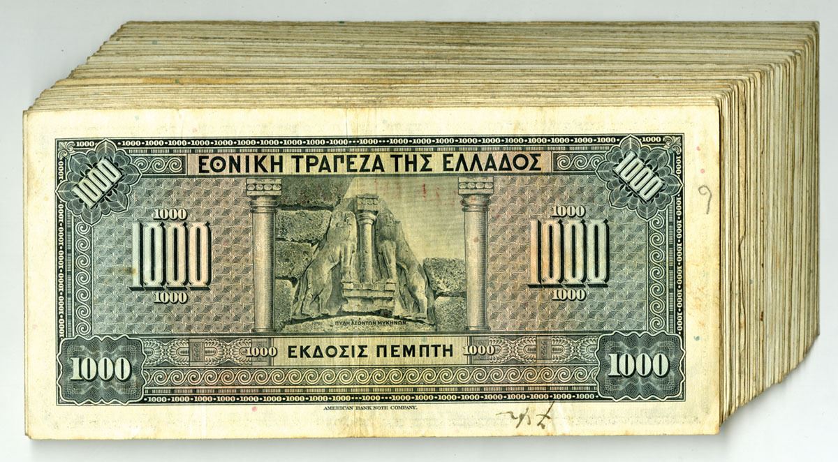 Greece, 1926. 1000 Drachmai, P-100, Issued Banknote Assortment, Black on green and m/c underprint with portrait of G. Stavros at center, Back is blue and pink underprint with stone carving at center with new bank name in curved writing at top. Notes range from Fine to VF condition. (80+). Sold "AS IS" no returns accepted.