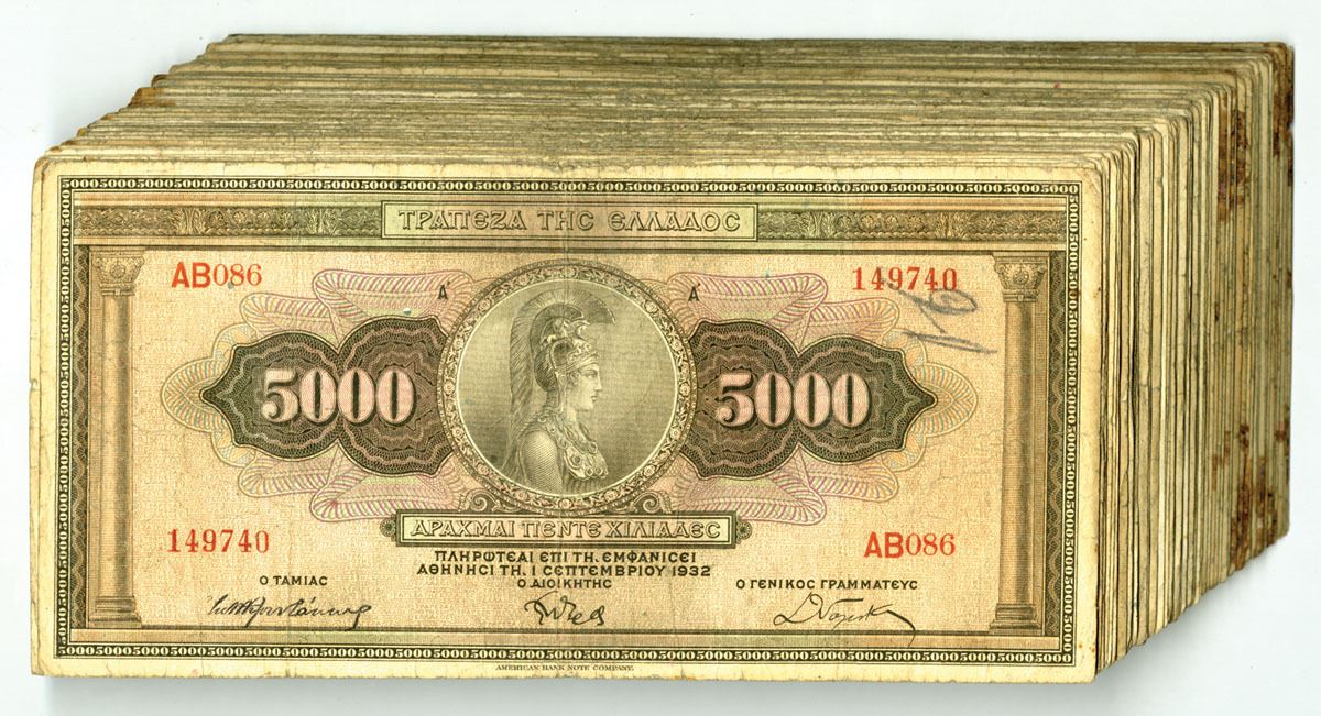 Greece, 1932. 5000 Drachmai, P-103a (100), Issued Banknote Assortment, Brown with pink and m/c underprint with Athena at center, Back is green with mythical bird at center, Notes are in Choice VG to Choice Fine condition. ABNC. (100). Sold "AS IS" no returns accepted.
