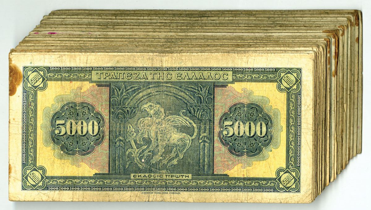 Greece, 1932. 5000 Drachmai, P-103a (100), Issued Banknote Assortment, Brown with pink and m/c underprint with Athena at center, Back is green with mythical bird at center, Notes are in Choice VG to Choice Fine condition. ABNC. (100). Sold "AS IS" no returns accepted.