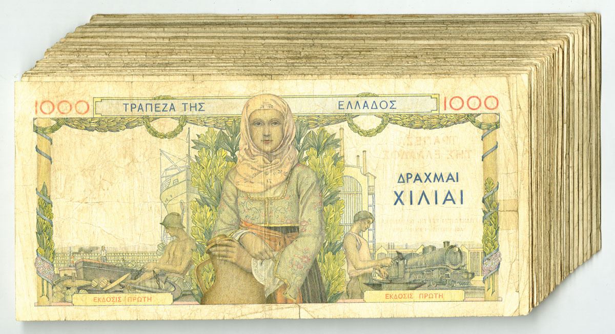 Greece, 1935. 1000 Drachmai, P-106a (95+), Issued Banknote Assortment, M/c printing with girl in national costume at center, Back is m/c with same girl on front flanked by workman and sailor, Notes are in Fine to VF condition. (95+). Sold "AS IS" no returns accepted.