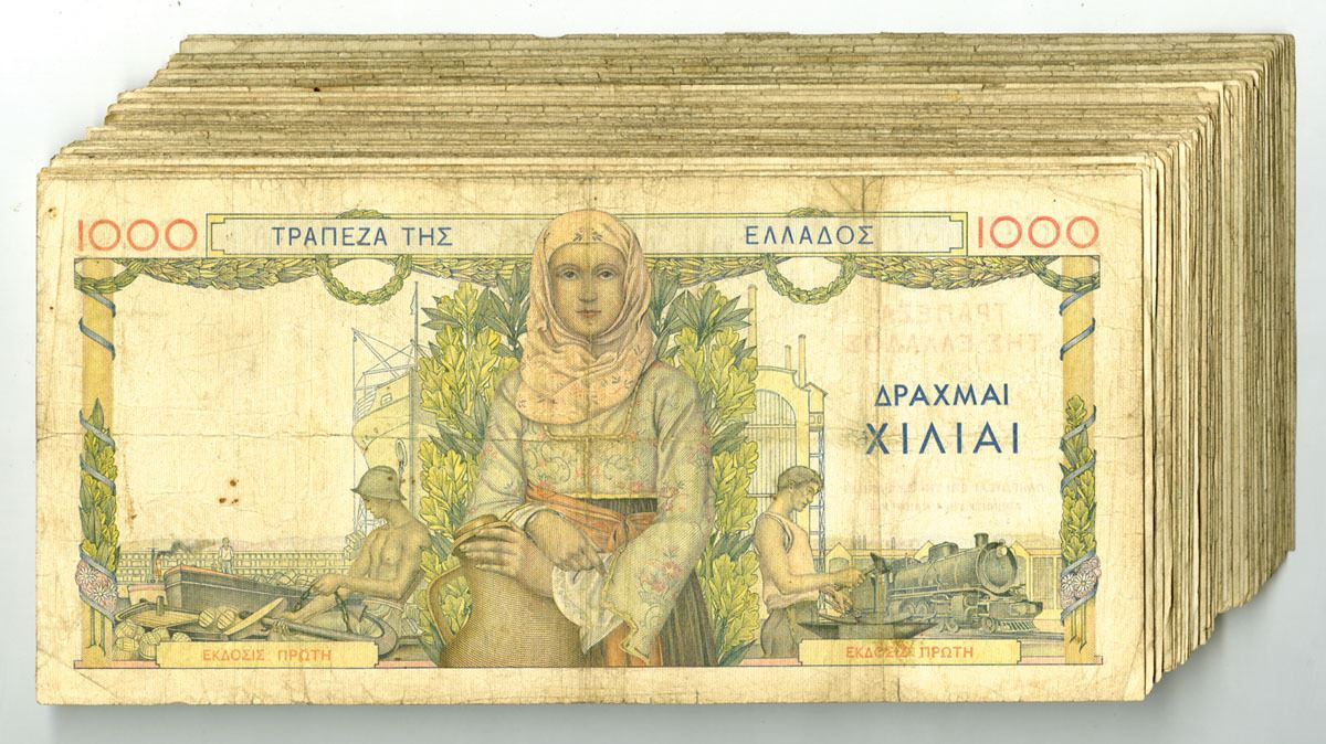 Greece, 1935. 1000 Drachmai, P-106a (95+), Issued Banknote Assortment, M/c printing with girl in national costume at center, Back is m/c with same girl on front flanked by workman and sailor, Notes are in Fine to VF condition. (95+). Sold "AS IS" no returns accepted.