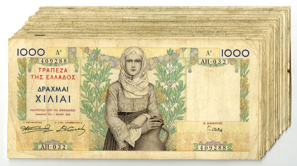 Greece, 1935. 1000 Drachmai, P-106a (26), Issued Banknote Assortment, M/c printing with girl in national costume at center, Back is m/c with same girl at center flanked by workers at left and right, Notes range from VF to VF+ condition. (26). Sold "AS IS" no returns accepted.