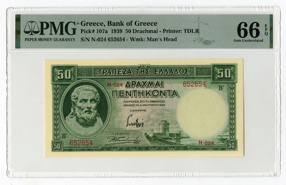 Greece, 1939. 50 Drachmai, P-107a, Issued Banknote, Green on pink underprint with bust of Hesiod at left, Back is green with frieze at center, S/N N-024 652654, PMG graded Gem Uncirculated 66 EPQ, TDLR.