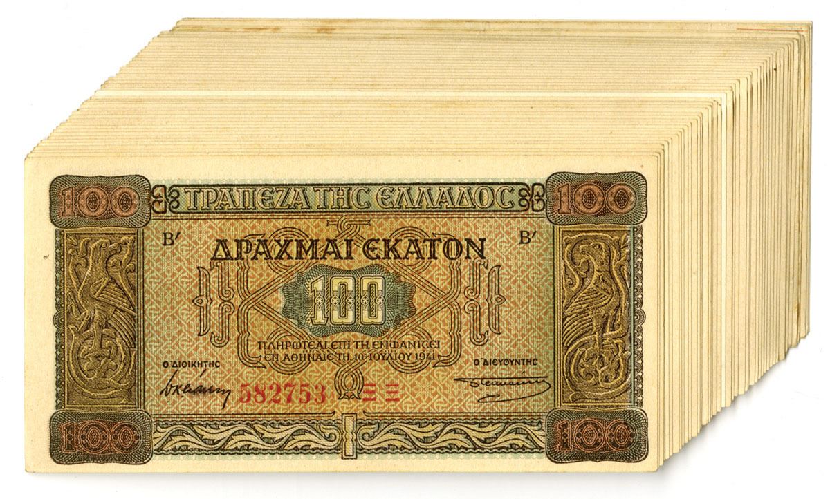 Greece......, 1941. 100 Drachmai, P-116a (46), Issued Banknote Assortment, Brown on m/c printing with bird frieze at left and right with bank title at top center, Back is black on pale blue/green with Kapnikarea Church at center, Some of the notes are Sequential, Choice VF to AU condition, most with bent corners. (46). Sold "AS IS" no returns accepted.