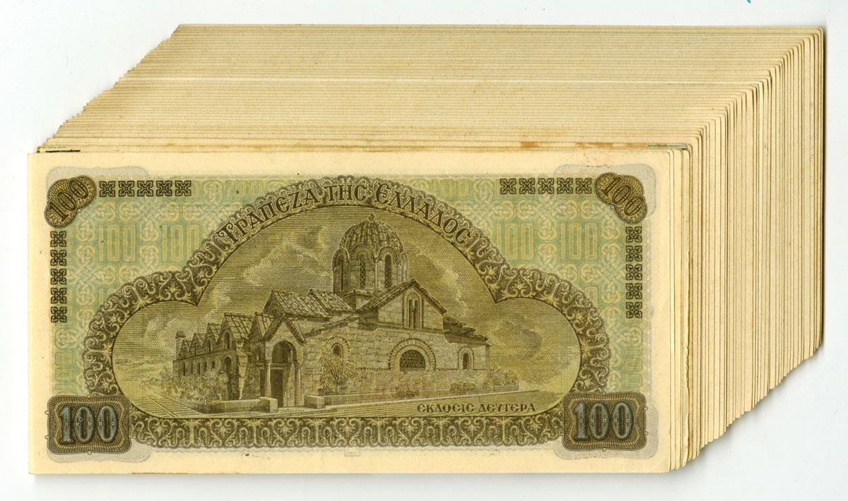 Greece......, 1941. 100 Drachmai, P-116a (46), Issued Banknote Assortment, Brown on m/c printing with bird frieze at left and right with bank title at top center, Back is black on pale blue/green with Kapnikarea Church at center, Some of the notes are Sequential, Choice VF to AU condition, most with bent corners. (46). Sold "AS IS" no returns accepted.