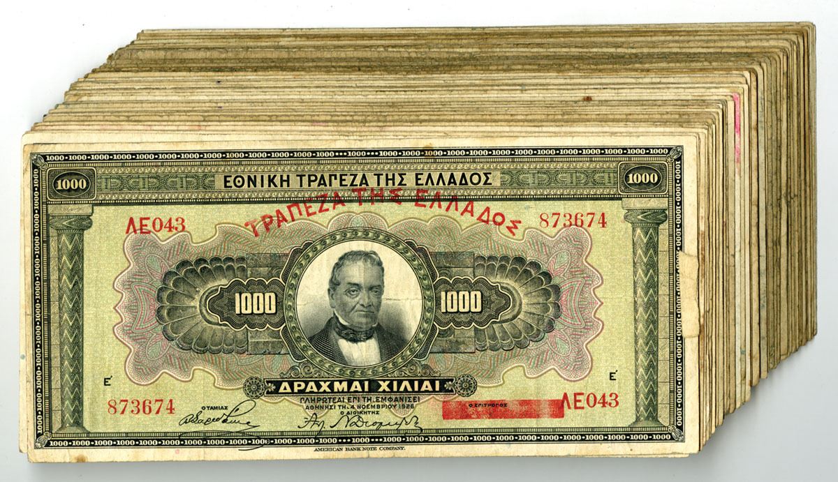 Greece, ND (Old Date 1926). 1000 Drachmai, P-100 (67), Issued Banknote Assortment, Black on green and m/c underprint, Portrait of G. Stavros at center with new bank name overprinted in red below old bank name at top, Back is blue and pink underprint with stone carving at center, Notes range from Fine to VF+ condition. ABNC. (67). Sold "AS IS" no returns accepted.