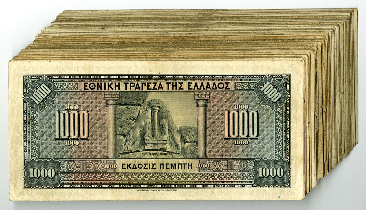 Greece, ND (Old Date 1926). 1000 Drachmai, P-100 (67), Issued Banknote Assortment, Black on green and m/c underprint, Portrait of G. Stavros at center with new bank name overprinted in red below old bank name at top, Back is blue and pink underprint with stone carving at center, Notes range from Fine to VF+ condition. ABNC. (67). Sold "AS IS" no returns accepted.