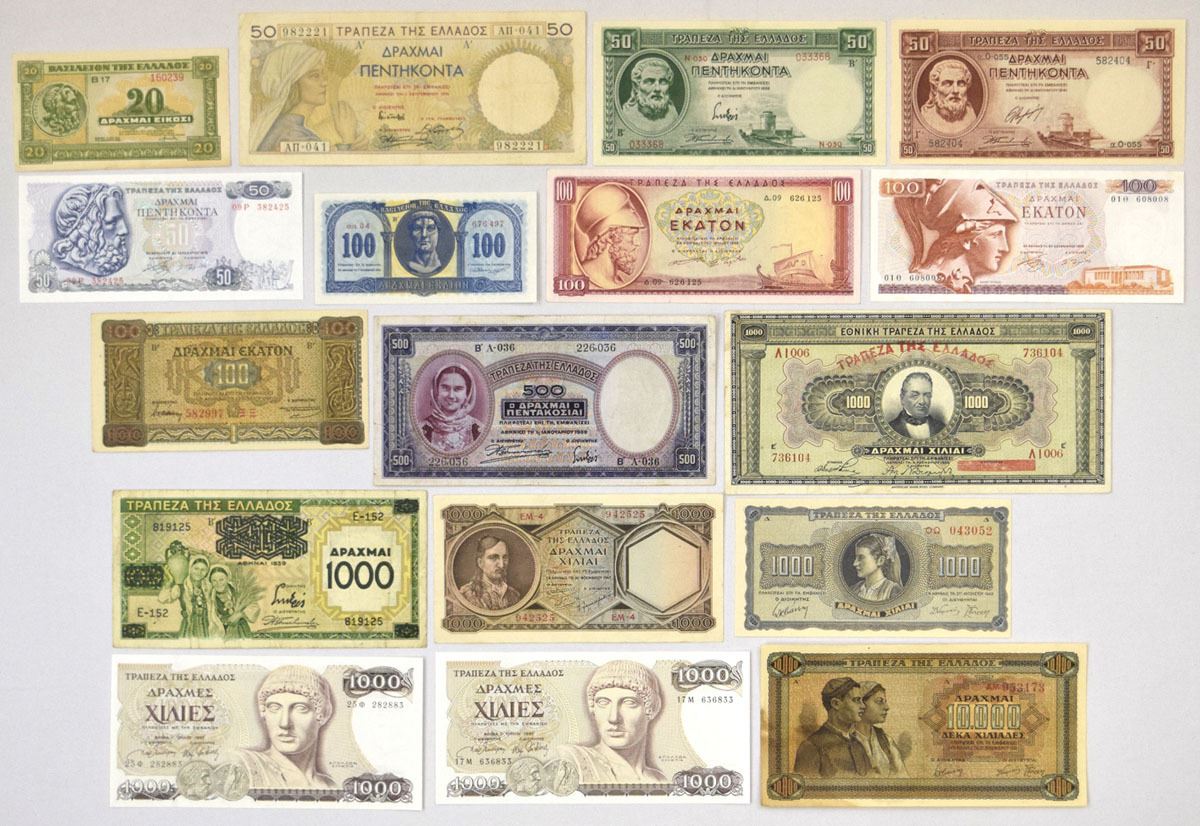Greece....., 1926-78. Lot of 17 Issued Banknotes, Includes: Bank of Greece, ND (Old Date 1926), 1000 Drachmai, P-100b; 1935, 50 Drachmai, P-104a; 1939, 50 Drachmai, P-107a, TDLR; 500 Drachmai, P-109, BWC; 1939, 1000 Drachmai on 100 Drachmai, P-111a; German/Italian Occupation - WWII, 1941, 100 Drachmai, P-116a; 1942, 1000 Drachmai, P-118a; 10,000 Drachmai, P-120; Bank of Greece, 1941 (1945), 50 Drachmai, P-168a; Bank of Greece - Post WWII, 1947, 1000 Drachmai, P-172a, BWC; Kingdom of Greece, 1940, 20 Drachmai, P-315; 1953, 100 Drachmai, P-324b; 1955, 100 Drachmai, P-192b; 1978, 50 Drachmai, P-199a; 100 Drachmai, P-200a; 1987, 1000 Drachmaes, P-202a (2). Notes range from VF+ to AU notes or better condition. (17). Sold "AS IS" no returns accepted.
