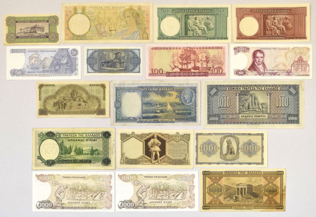 Greece....., 1926-78. Lot of 17 Issued Banknotes, Includes: Bank of Greece, ND (Old Date 1926), 1000 Drachmai, P-100b; 1935, 50 Drachmai, P-104a; 1939, 50 Drachmai, P-107a, TDLR; 500 Drachmai, P-109, BWC; 1939, 1000 Drachmai on 100 Drachmai, P-111a; German/Italian Occupation - WWII, 1941, 100 Drachmai, P-116a; 1942, 1000 Drachmai, P-118a; 10,000 Drachmai, P-120; Bank of Greece, 1941 (1945), 50 Drachmai, P-168a; Bank of Greece - Post WWII, 1947, 1000 Drachmai, P-172a, BWC; Kingdom of Greece, 1940, 20 Drachmai, P-315; 1953, 100 Drachmai, P-324b; 1955, 100 Drachmai, P-192b; 1978, 50 Drachmai, P-199a; 100 Drachmai, P-200a; 1987, 1000 Drachmaes, P-202a (2). Notes range from VF+ to AU notes or better condition. (17). Sold "AS IS" no returns accepted.
