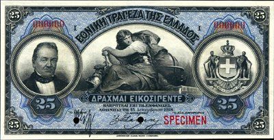 1918. P-65 Unlisted. 25 Drachmai 2 different specimens with different dates. One is dated September 5, 1918 and the second is dated December 15, 1918. Both are in choice Unc. condition. These notes are the base notes for P-65, since the issued notes have the overprint "NEON" on the right side and these are missing this overprint. Scarce pair. ABNC.