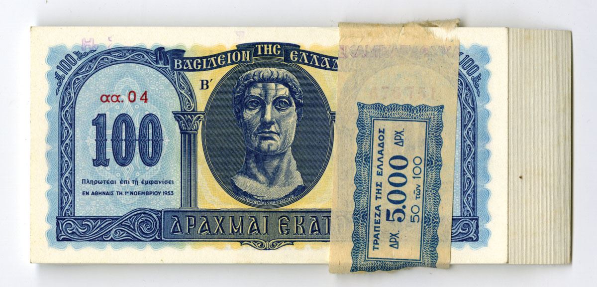 Greece...., 1953. 100 Drachmai, P-324b (50), Pack of Issued Banknotes, Blue on orange underprint with bust of Constantine at center, Back is blue and yellow with church at center, Notes are wrapped in original packaging from bank and are in Choice AU to UNC condition. (50). Sold "AS IS" no returns accepted.