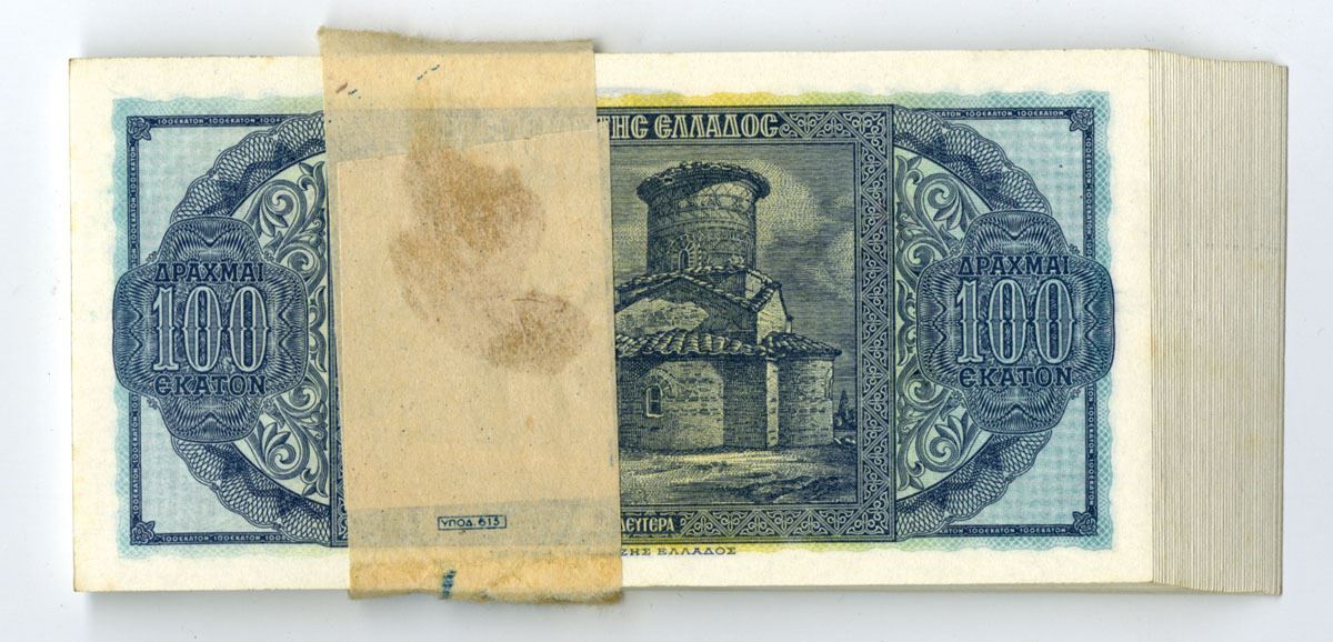 Greece...., 1953. 100 Drachmai, P-324b (50), Pack of Issued Banknotes, Blue on orange underprint with bust of Constantine at center, Back is blue and yellow with church at center, Notes are wrapped in original packaging from bank and are in Choice AU to UNC condition. (50). Sold "AS IS" no returns accepted.