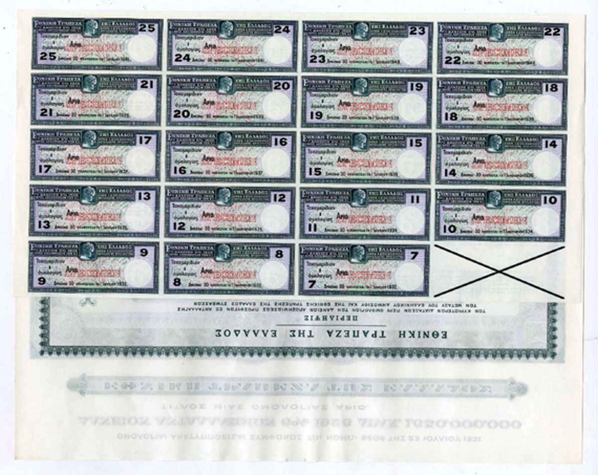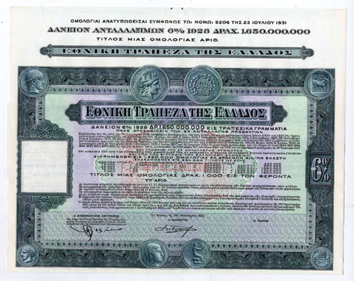 Greece, 1932. 1000 Drachma Specimen 6% Coupon Bond, Black on green border and m/c underprint, Printed in Greek, Specimen overprint, AU-Unc condition, BWC.