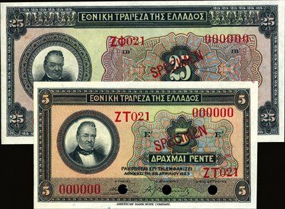 1923. P-73; P-74 Unlisted Specimen. 5; 25 Drachmai. 2 different specimen banknotes. "1923 Second Issue". Both with red specimen overprints, "00000" serial numbers and POC's. Both in uncirculated condition. Scarce notes. ABNC.