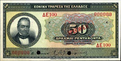 1923. P-75 Unlisted Specimen. 50 Drachmai. Specimen banknote. "1923 Second Issue". Red specimen overprint, "00000" serial numbers and POC's. Choice uncirculated condition. Scarce note. ABNC.