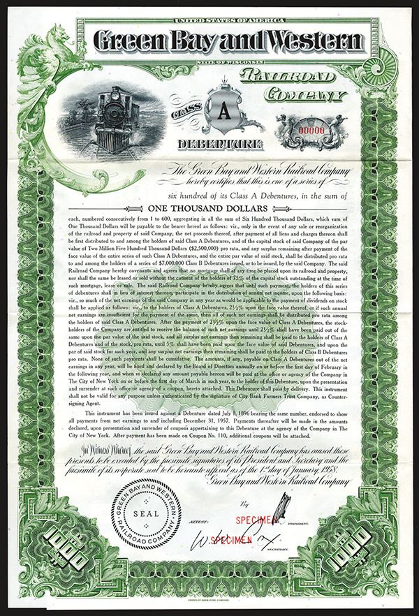 Wisconsin. 1958. $1000 Class A Specimen Bond. Black print with green border and underprint. Locomotive head-on top left. POC's and red SPECIMEN overprints. VF-XF condition. ABNC. Listed railroad but unlisted class of bond in Cox.