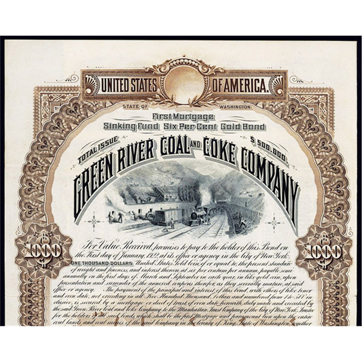 Washington, 1892, $1000, Specimen bond, Trains at mine on top with miners and mill at bottom. Brown, Franklin BNC, POC's, XF.