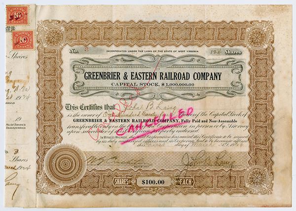 West Virginia. 1924, brown, title in ornate frame, S/N 3, issued, pen cancelled, some age toning.