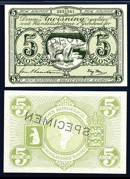 Greenland, ND (1953-1967), 5 Kroner, P-18s, Specimen banknote, S/N 0651541, Pin-punch SPECIMEN, PMG graded Gem Uncirculated 66 EPQ, this will be difficult to improve upon.