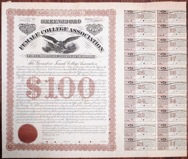 Greensboro, North Carolina, 1st July, 1884. $100 Specimen 6% First Mortgage Thirty Year Coupon Bond. Black and brown printing with Bald Eagle and flag at top. Pin punched canceled at bottoms and each coupon is pin punched as well. VF-XF condition. FBNC. The first college to open its doors within the town of Greensboro was the woman's college, Greensboro Female College. The institution had its origin in 1833, when the Greensboro Female College was organized as an institution for local children. It was the intent of the Rev. Peter Doubt that the institution grow to serve women. Through the Methodist Church, a charter was secured in 1838, an event which makes the college one of the oldest institutions of higher education for women in the United States. The college became coeducational in the late 1950s. The cornerstone of the first building was laid in 1843, and in 1846 the institution opened its doors to students. Young women came from many southern states to become the first classes of the new president, the Rev. Solomon Lea, and his faculty.