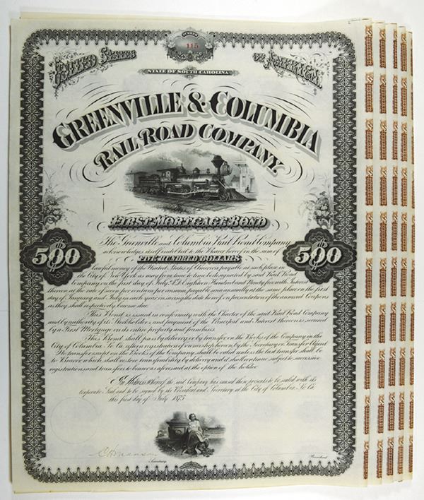 South Carolina. $500 Coupon Bond. Partially signed, unissued. All coupons remain. Wonderful Baldwin Locomotive vignette at upper center. All 40 coupons remain. Continental BNC imprint. Consecutive serial # 111-115. Slightest bend between bond and coupon section. Extremely Fine. 5 pieces.