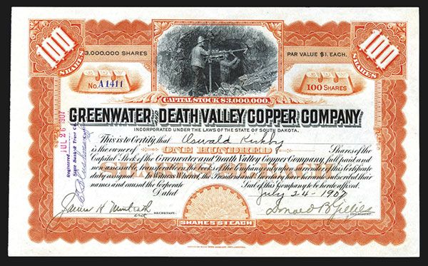 Mines located in Death Valley, California (Incorporated in SD), 100 Shares, Black on orange underprint and border with miners drilling into mine walls, XF condition, The certificate was issued to Oswald Kirby and is endorsed by him on the verso. The certificate has not been folded and is in EF condition. A major mine in the Greenwater district, the Greenwater and Death Valley Copper Company, which was owned and operated by one of the great business magnates of the early twentieth century, Charles Schwab. ABNC.