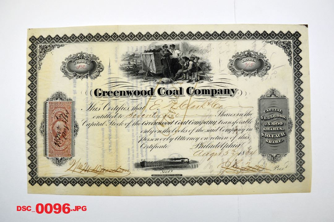 Philadelphia, Pennsylvania. 75 Shares I/C Stock Certificate, Black print on black border, Image of men taking a mining break at top, Revenue stamp at bottom left corner, Fine-VF condition, ABNC.