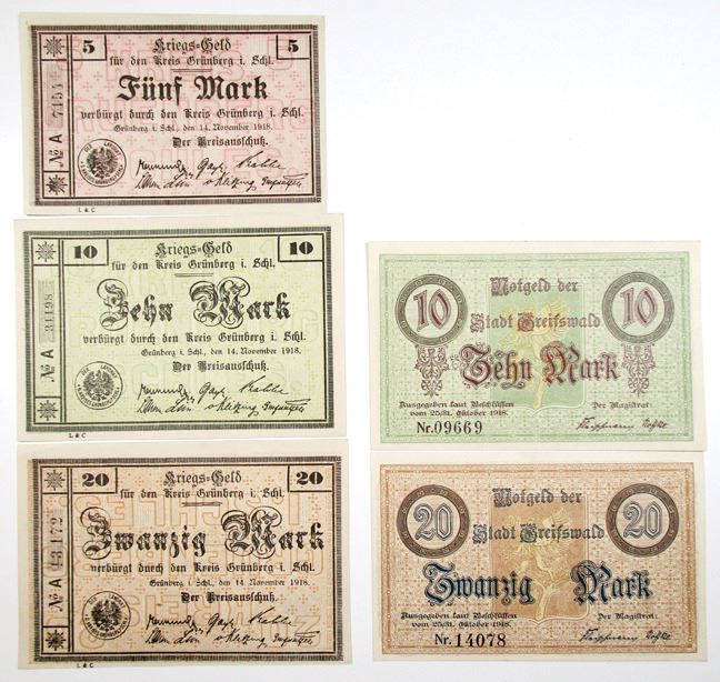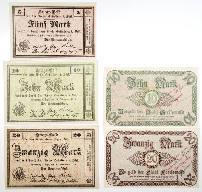 Germany. 1918, Lot of 5 POW Notgeld, includes a pair of 10 and 20 Mark Notgeld from Greifswald; and from GrŸnberg a trio of 5, 10, and 20 Mark war Notgeld. About to Choice Unc. (5)