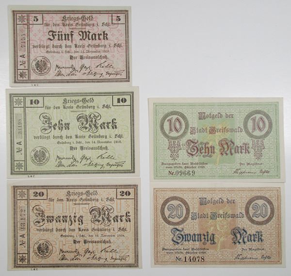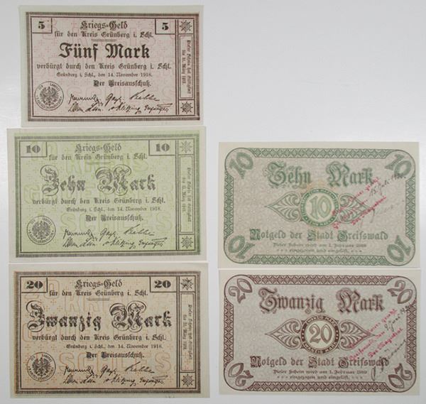 Germany. 1918, Lot includes from Greifswald a pair of 10 and 20 Mark Notgeld; and from GrŸnberg a trio of 5, 10, and 20 Mark war Notgeld. About to Choice Unc. (5)