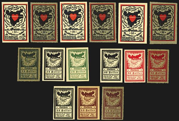 Austria. Different colors or paper used for each set (including waxed paper). 3 sets of 5, 15 pieces total.