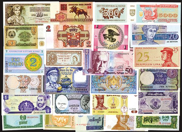 This collection includes 25 different issued notes from various countries with a good representation of CIS states such as Moldova, Ukraine, Kazakhsan, Lithuania, Latvia, Belarus as well as Asian countries like Hong Kong, India and Pakistan. Mostly modern and all UNC. A very diverse starter collection.