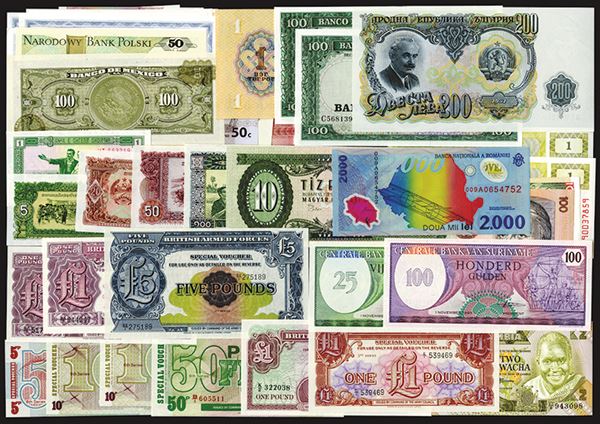 This collection includes 46 different issued notes from various countries worldwide, including Albania, Belarus, Bulgaria, China, Congo, Croatia, Estonia, Hungary, Indonesia, Latvia, Lithuania, Macedonia, Poland, Mexico, Mongolia, Mozambique, Peru, Slovenia, Suriname, Romania, Russia, Ukraine, and Zambia. Also includes 9 British Armed Forces pieces from 2nd, 3rd, 4th, and 6th issues, including several 1 and 5 Pound notes. Mostly modern and all UNC. A very diverse starter collection. Sold as is.