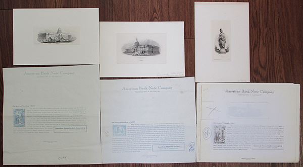 Lot includes 6 pieces: 3 Intaglio Vignettes depicting a the figure of "Freedom" that is atop the Capitol Building, the United States Capitol Building, and another prominent building; 3 American Bank Note production materials for commemorative cards depicting The Story of Freedom - Part I; The Story of Freedom - Part II; The Story of Freedom - Part I with production edits. All 6 pieces include some notations in pencil made during production. A rare and unique lot of commemorative ABNC printing items.