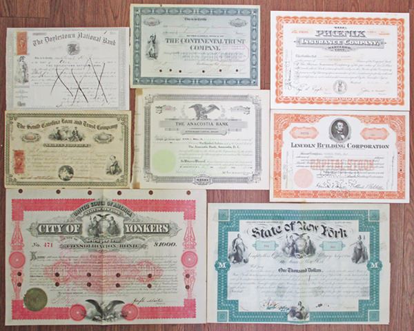 Group of 8 pieces, highlights include: $1000 I/C 7% State of New York bond, 1866; 5 Shares I/C Capital Stock Certificate for the Continental Trust Co., 1901; 30 Shares I/C Capital Stock Certificate for the Lincoln Building Corp., 1943.