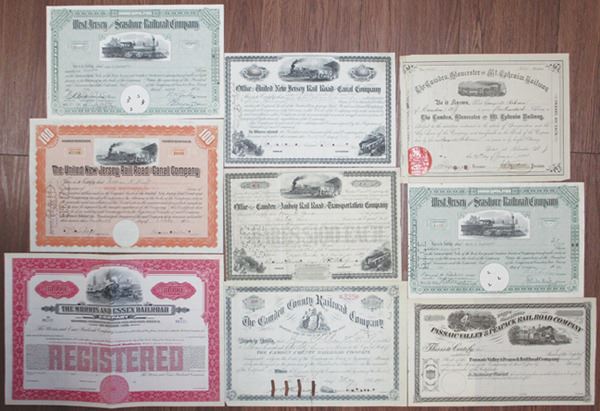 NJ. Lot of 9 items, highlights include: Morris and Essex Railroad Co.; West Jersey and Seashore Railroad Co.; Camden County Railroad Co.; Passaic Valley & Peapack Railroad Co.; and Camden, Gloucester and Mt. Ephraim Railway. 9 pieces.