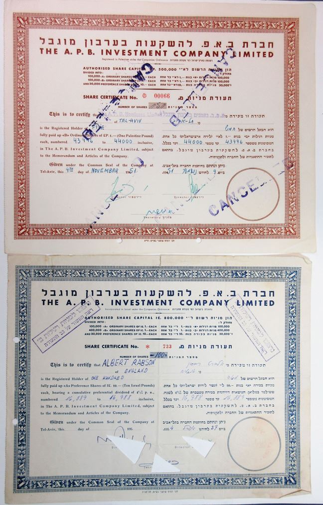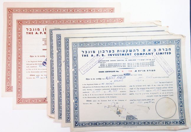 Palestine/Israel.... Group of 8 I/C, Stock Certificates, 3 certificates are for Series B Shares and 5 are for Series A Shares. All are in Fine-VF condition. (8 Pieces.)