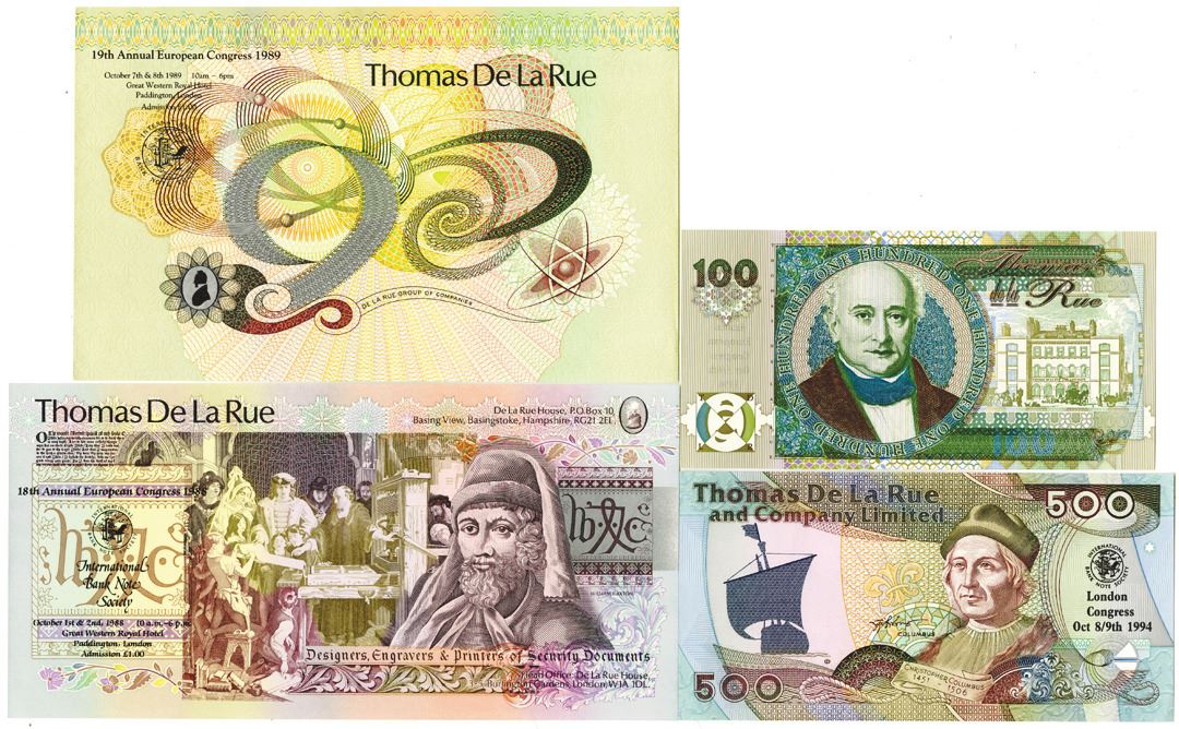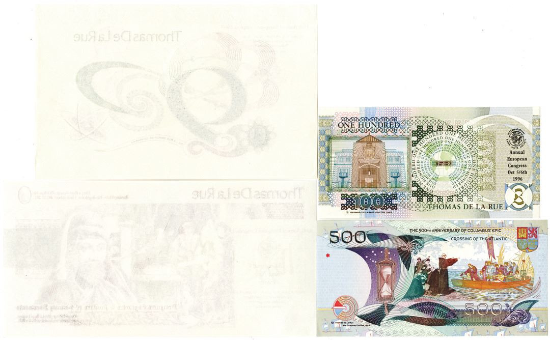 U.K., Lot of 4 De La Rue advertising notes, 1 celebrating 500th anniversary of Columbus's journey, 2 are over sized notes. All notes are Choice Au-UNC condition. (4) (Arthur C. Matz Collection)
